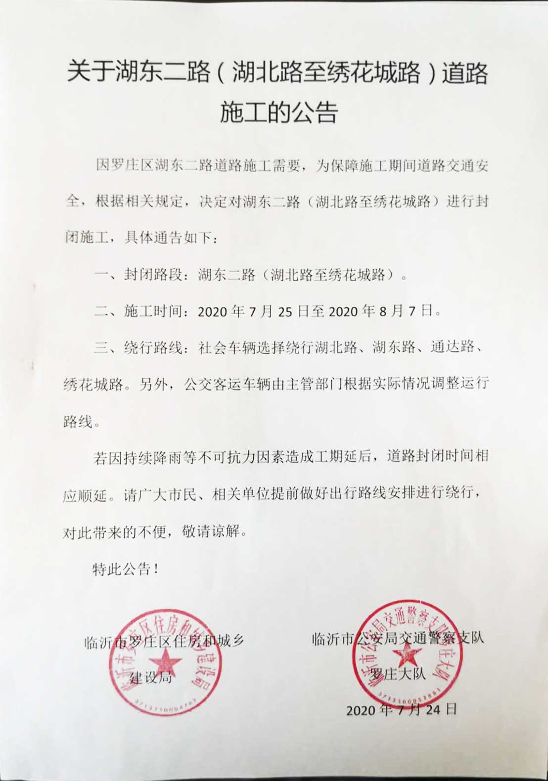 因罗庄区湖东二路道路施工需要,为保障施工期间道路交通安全,根据相关规定,决定对湖东二路(湖北路至绣花城路)进行封闭施工,具体通告如下: