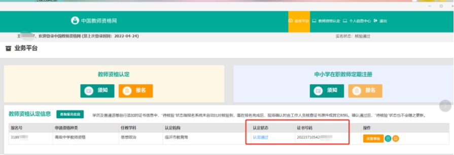 (2)我市第二批次证书签发日期为2022年7月8日(非证书领取和发放日期),如需证书编号,可登陆中国教师资格网(https://www.jszg.edu.cn/),通过“教师资格认定申请人网报入口”进入个人账号后,即可查看认定状态,认定通过的证书号码在右侧一并显示。
