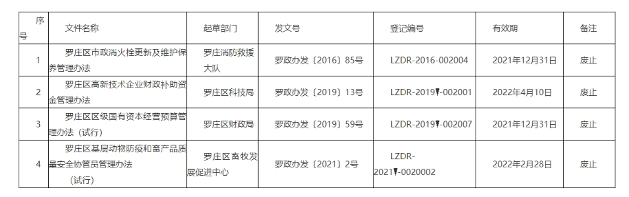为进一步加强政府规范性文件管理,优化全区经济社会发展的法治环境,根据《山东省行政程序规定》及省、市、区政府依法行政工作要求,对罗庄区2022年5月1日前以区政府或区政府办名义下发的23件规范性文件进行了清理,其中,继续有效的规范性文件19件,废止的4件。继续有效的19件中,2件报请延长有效期限。
