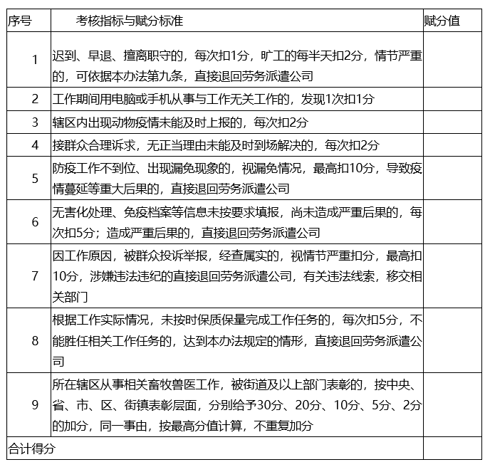 第八条 村级动物防疫员实行月度考评和年度考评相结合方式。每月由辖区基层动物检疫分所按《动物防疫和畜产品质量安全协管员工作目标量化考核评分标准》(附后),对防疫员进行考评,每月平均分即为年度考核得分,年度考核得分排名前30%的,颁发优秀村级动物防疫员证书,每月及年终考评情况要报区畜牧兽医主管部门备案。区畜牧兽医主管部门根据月度和年度考核情况,将平均得分低于60分或出现重大工作失误和责任事故的防疫员人员,退回第三方派遣公司,予以解聘。