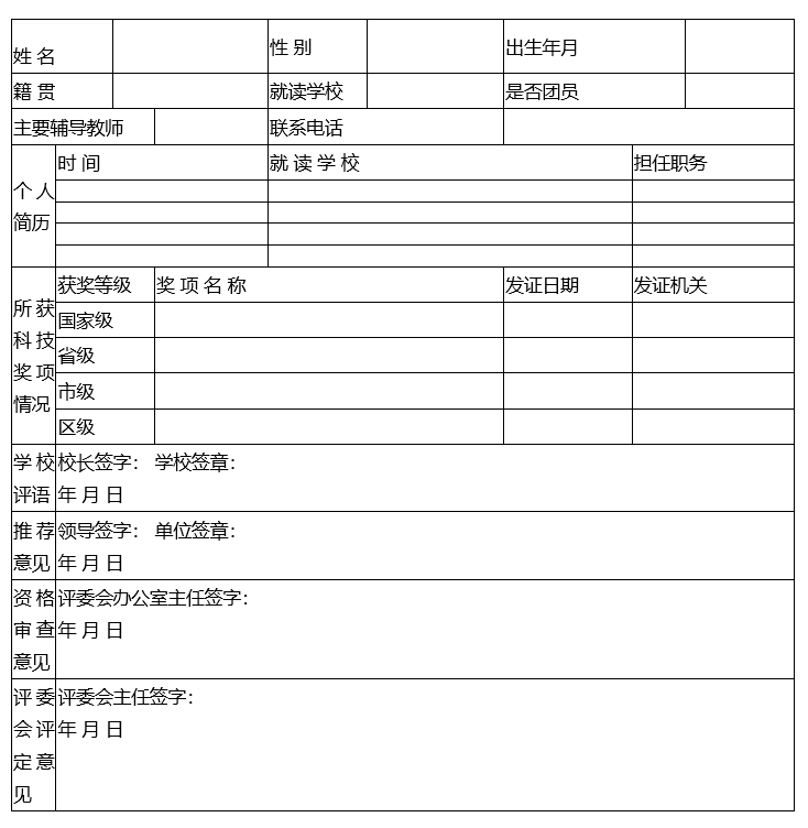 罗庄区青少年科技创新区长奖候选人申报表