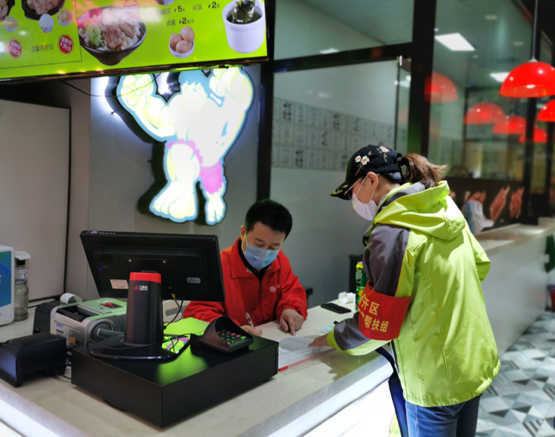 4月9日,天津市金融局下沉干部(右)在市内一家商场了解中小微企业复工情况,并送去防疫物资。新华社记者 刘惟真 摄