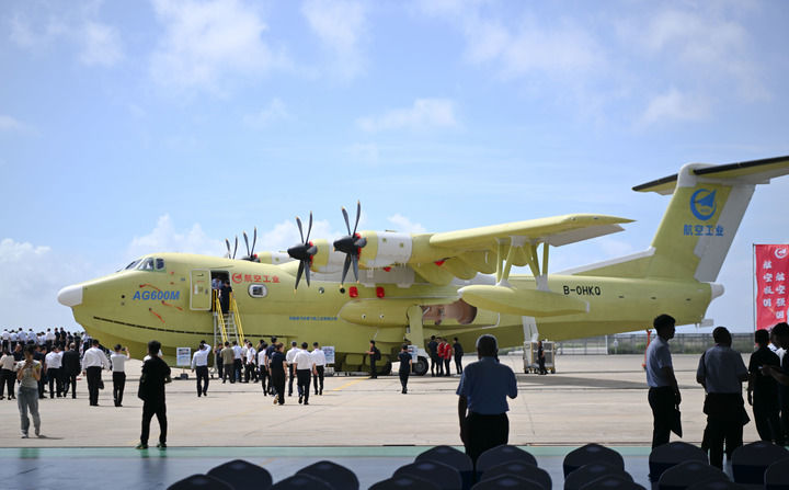 2025年6月11日在珠海中航通飞华南飞机工业有限公司拍摄的批量生产的首架AG600飞机。当日,大型水陆两栖飞机AG600“鲲龙”获颁中国民航局生产许可证,标志着AG600飞机正式迈入批量生产阶段。新华社记者 邓华 摄