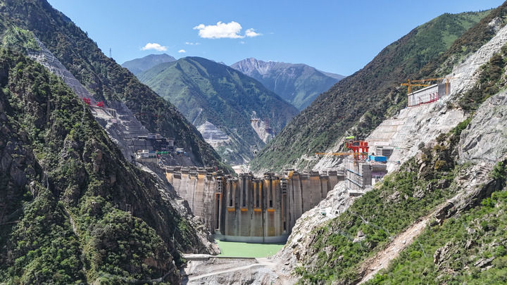 这是2025年6月30日拍摄的建设中的叶巴滩水电站(无人机照片)。该水电站地处四川甘孜州白玉县与西藏昌都市贡觉县交界处的金沙江上游,总装机容量224万千瓦。新华社发(陈浩 摄)