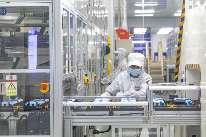 2024年9月27日,在位于重庆市铜梁区的海辰储能重庆制造基地,工作人员在生产线上初步检测两个电芯是否配对。新华社记者 黄伟 摄
