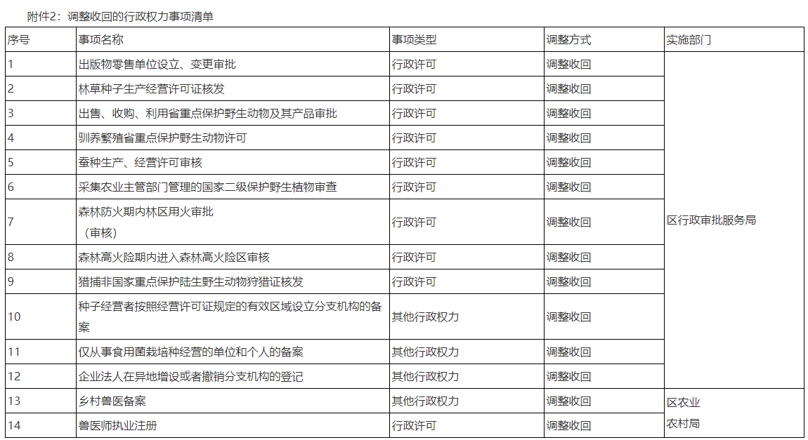 (二)收回(14项)。将14项(包括10项行政许可、4项其他行政权力)原委托下放至街镇的行政权力事项,收回区直部门实施,街镇不再受理此类事项。