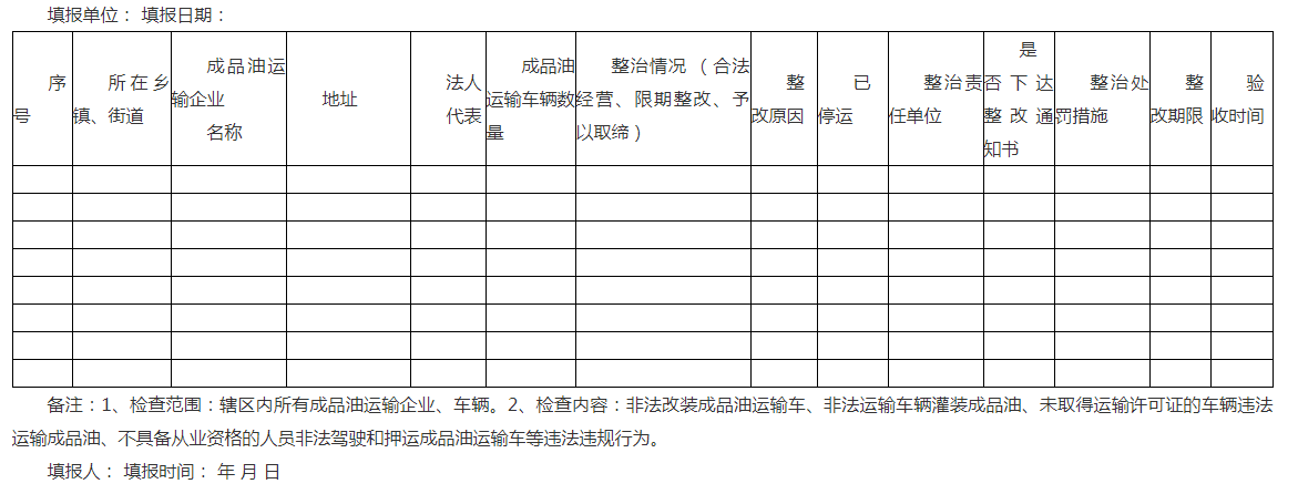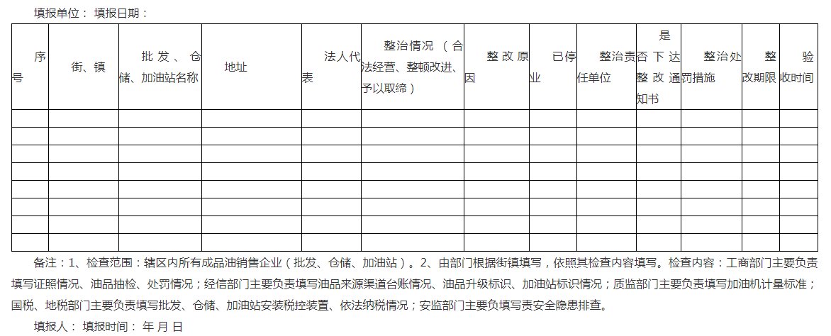 专项整治行动期间实行周报表制度,各有关单位每周五上午12:00前将工作台账(附件1、2、3、4、5)及周报表(附件6)电子版通过协同办公系统报送至区经信局成品油管理科。各街镇成品油生产经营企业专项整治行动方案以正式文件的格式于4月30日前将书面材料报至区经信局;4月30日、6月30日、7月31日前,分别将工作台账(附件1、2、3、4、5)书面材料汇总,封面加盖单位公章经负责人签字后报送至区经信局,由区经信局汇总报区政府。