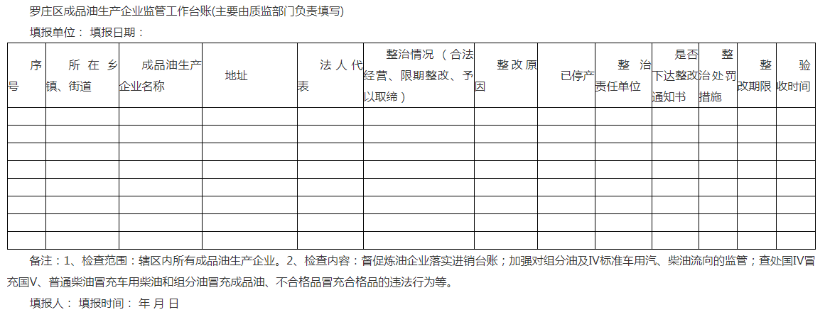 罗庄区成品油生产企业监管工作台账(主要由质监部门负责填写)