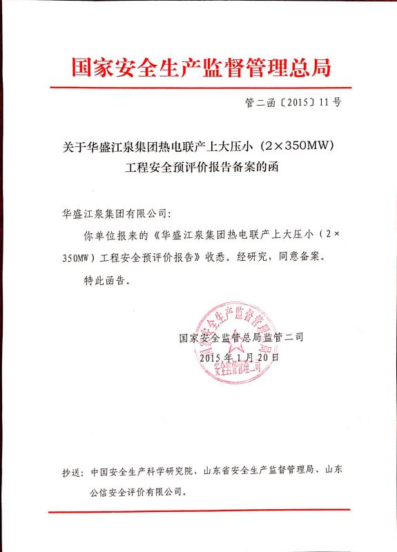 信息名称  华盛江泉热电项目安全预评价报告审批  成文日期  2015-01-21