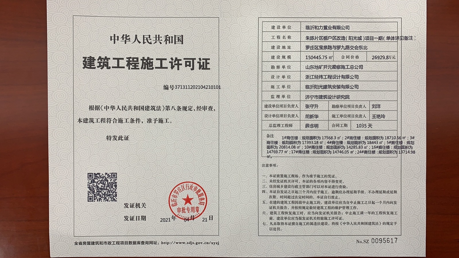 信息名称  朱陈片区棚户区改造(阳光城)项目一期建筑工程施工许可证  成文日期  2021-05-11