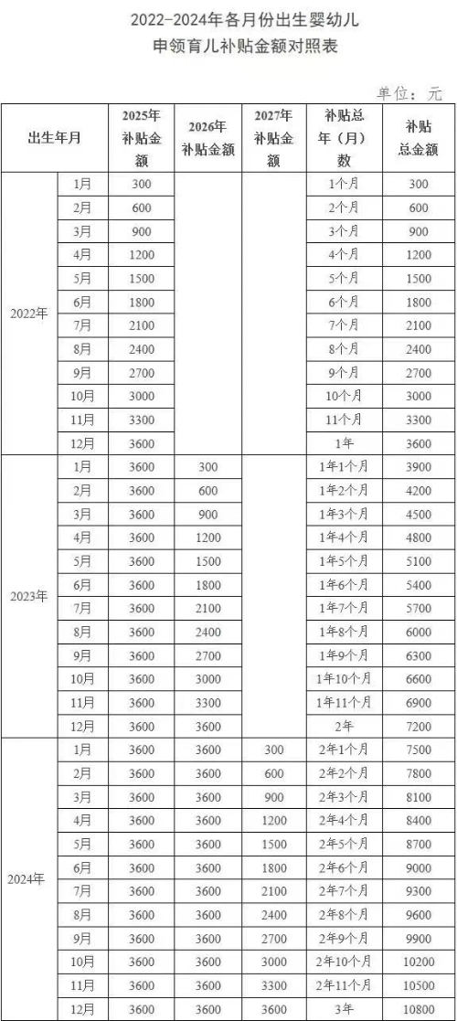 其中,对2025年1月1日之前出生、不满3周岁的婴幼儿,按应补贴月数折算计发补贴。也就是说,2022年1月1日以后出生的符合条件的婴幼儿,都可以领取育儿补贴。
