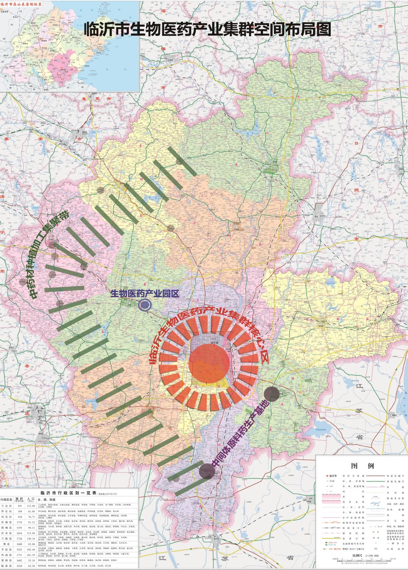 一核——生物医药工业与服务业融合发展集聚区。以沂河新区、兰山区、罗庄区、河东区、高新区为主体,汇集临沂市主要医药工业及生产服务业企业,主要布局化学药品、现代中药、生物制品、医疗器械、医药商贸物流等领域,打造二、三产有机融合的生物医药产业集群核心区。