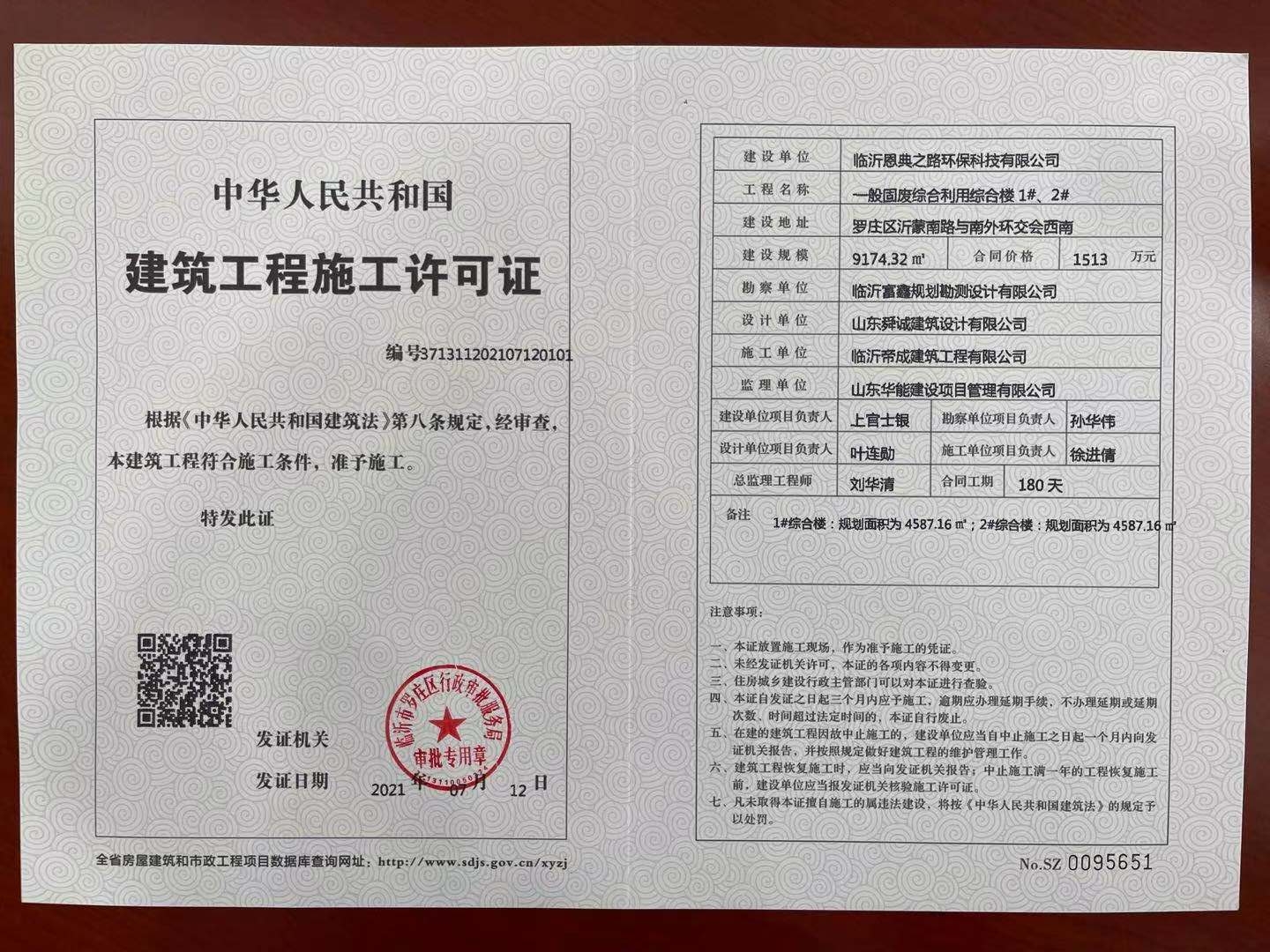 信息名称  罗庄街道一般固废综合利用项目施工信息-施工许可证  成文日期  2021-07-12