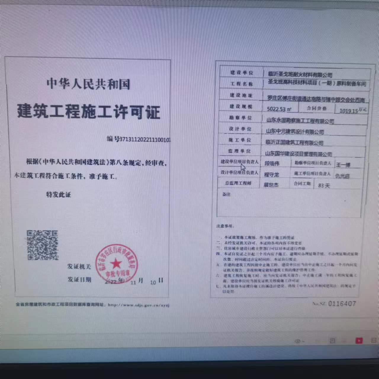 圣戈班高科技材料项目建筑工程施工许可证