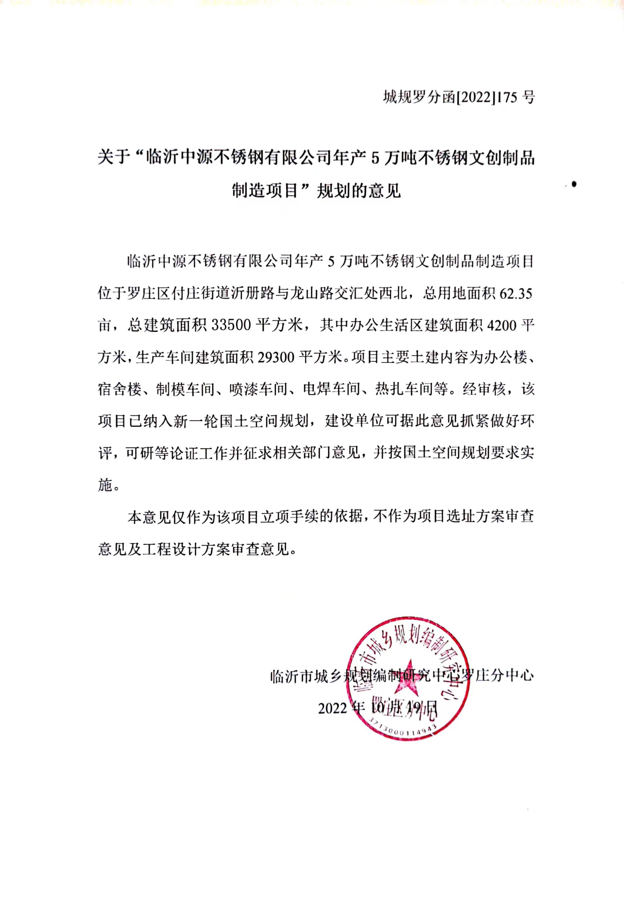 临沂中源不锈钢有限公司年产5万吨不锈钢文创制品制造项目