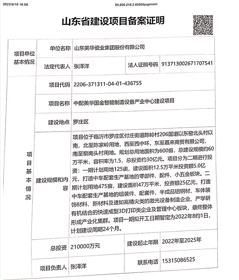 信息名称  中配美华国金智能制造设备产业中心项目备案证明  成文日期  2023-10-09
