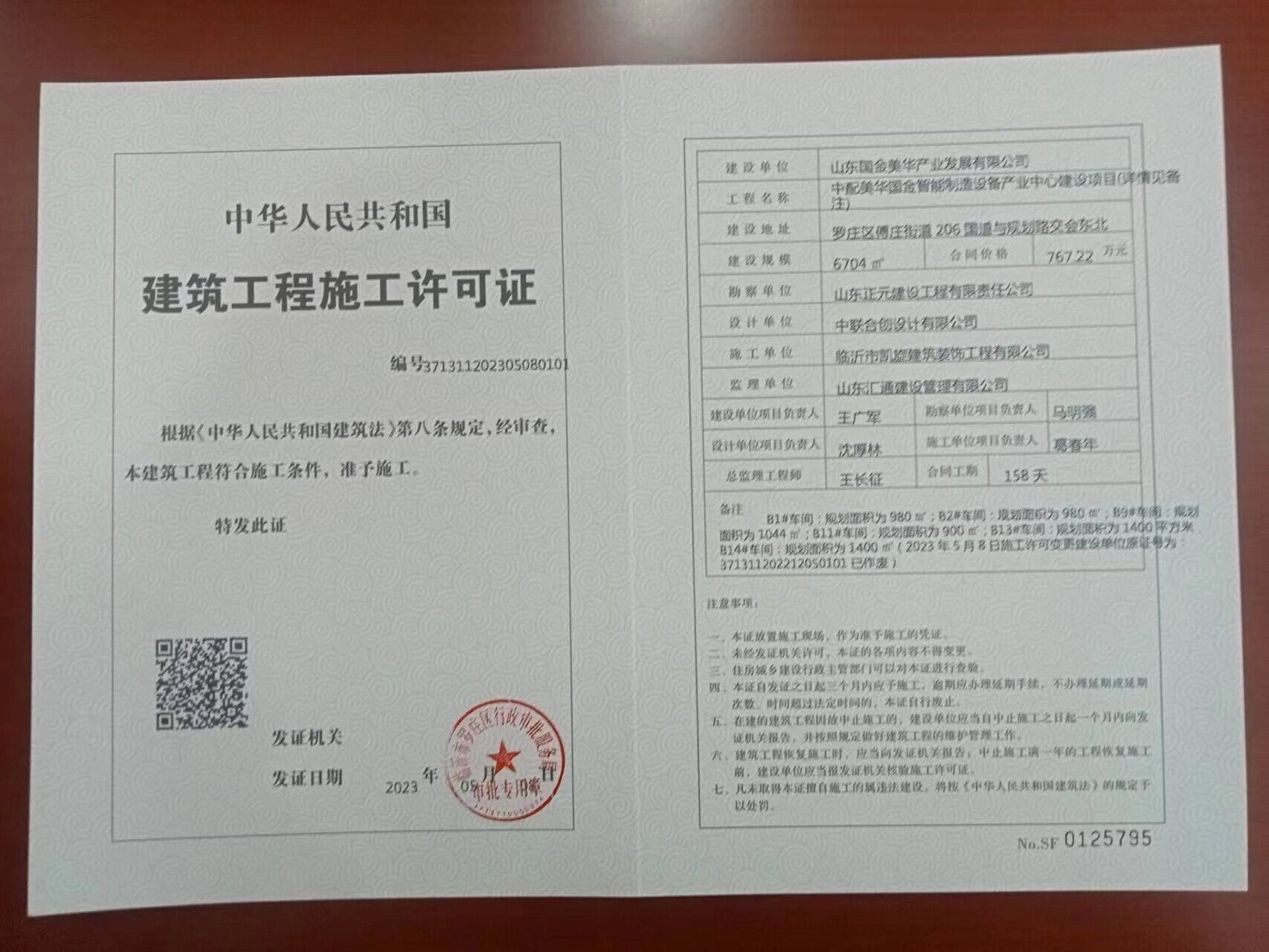 信息名称  中配美华国金智能制造设备产业中心项目建筑工程施工许可证  成文日期  2023-10-10